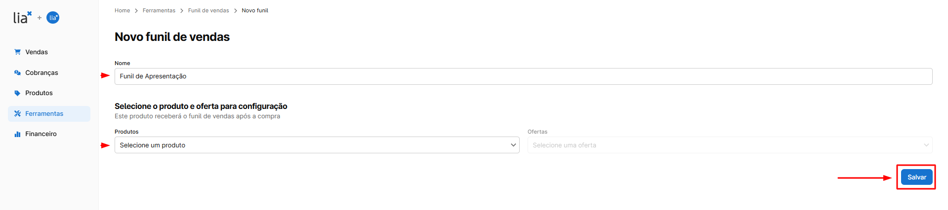Clique no funil, dê um nome a ele e escolha o produto previamente adquirido pelo aluno para oferecer outros produtos relacionados, como: cursos, mentorias, entre outros.