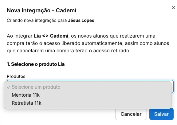 ⚠️ Importante: A integração será sempre realizada por produtos. Ou seja, toda vez que um produto novo for criado na Lia, é preciso repetir este processo!