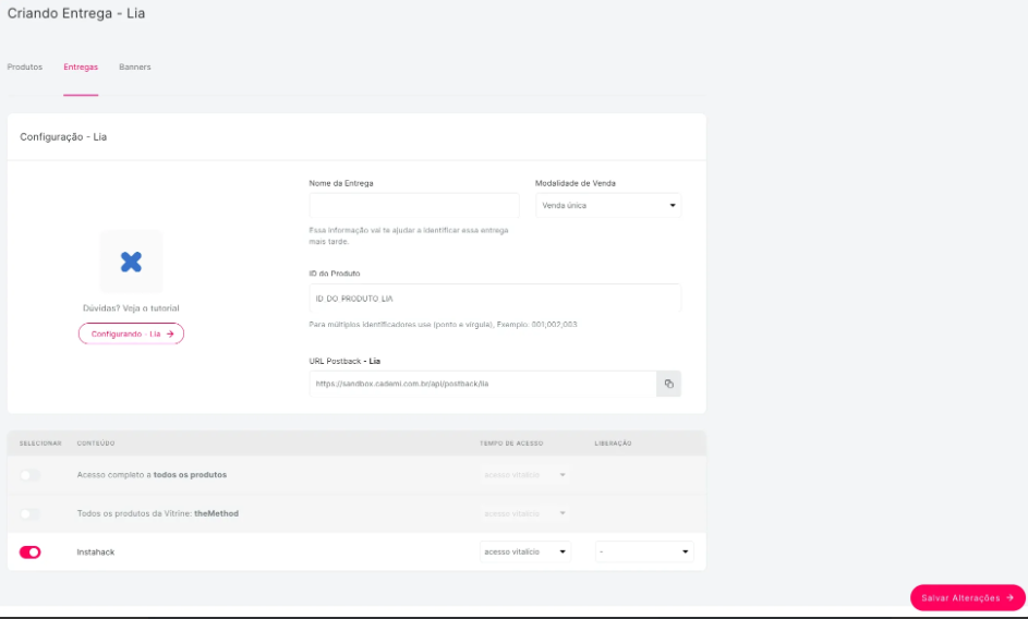 5) Copie o conteúdo do campo URL Postback - Lia informado pela Cademí, selecione os produtos que gostaria de liberar o acesso e clique em Salvar Alterações.
