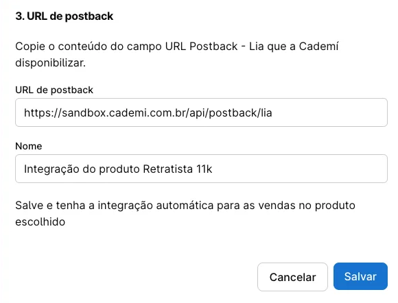 6) Volte até sua área do parceiro na Lia, cole a URL copiada da Cademí no campo URL de postback e clique em Salvar para finalizar a integração.