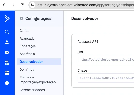 2) Em Configurações > Desenvolvedor, copie o conteúdo da URL e Chave.