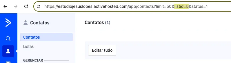 3) Em Contatos > Listas, acesse a lista que gostaria de cadastrar o aluno e copiar o conteúdo do listid que está na URL.