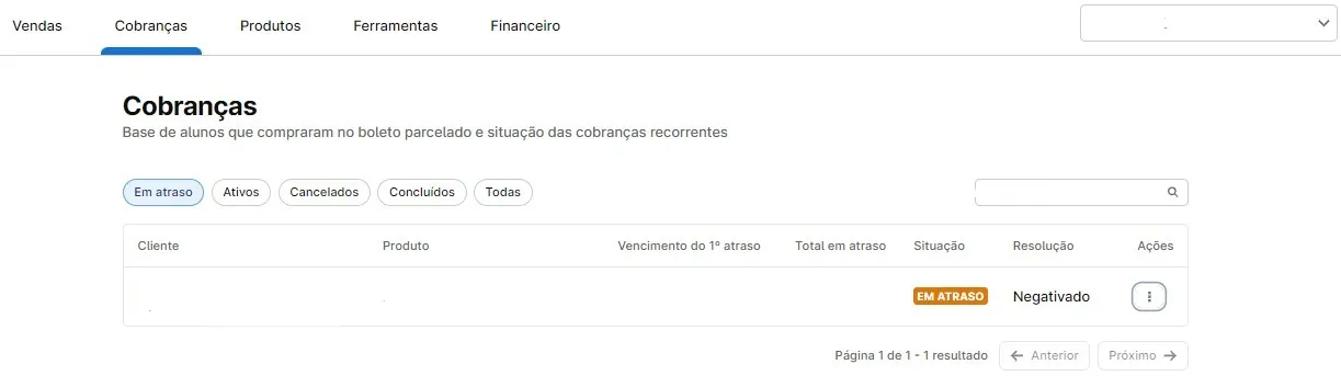 Em caso de negativação poderá acompanhar dentro do painel dentro da aba 'Cobranças', selecionar a opção ‘’em atraso’’ e o status do aluno será: