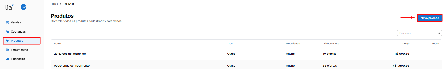 1. Para criar o seu produto, você deve clicar no botão “Novo produto” no canto superior direito da tela.