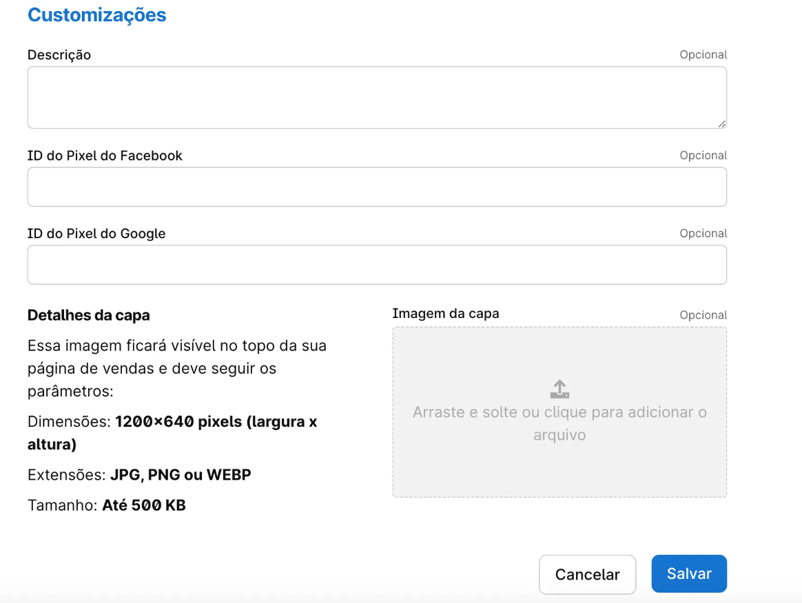 3. Personalizando o produto: Nessa parte, você poderá inserir o Pixel do Meta ou do Google para trackeamento e também a sua capa, que ficará a mostra no checkout principal! Todos os campos são opcionais.
