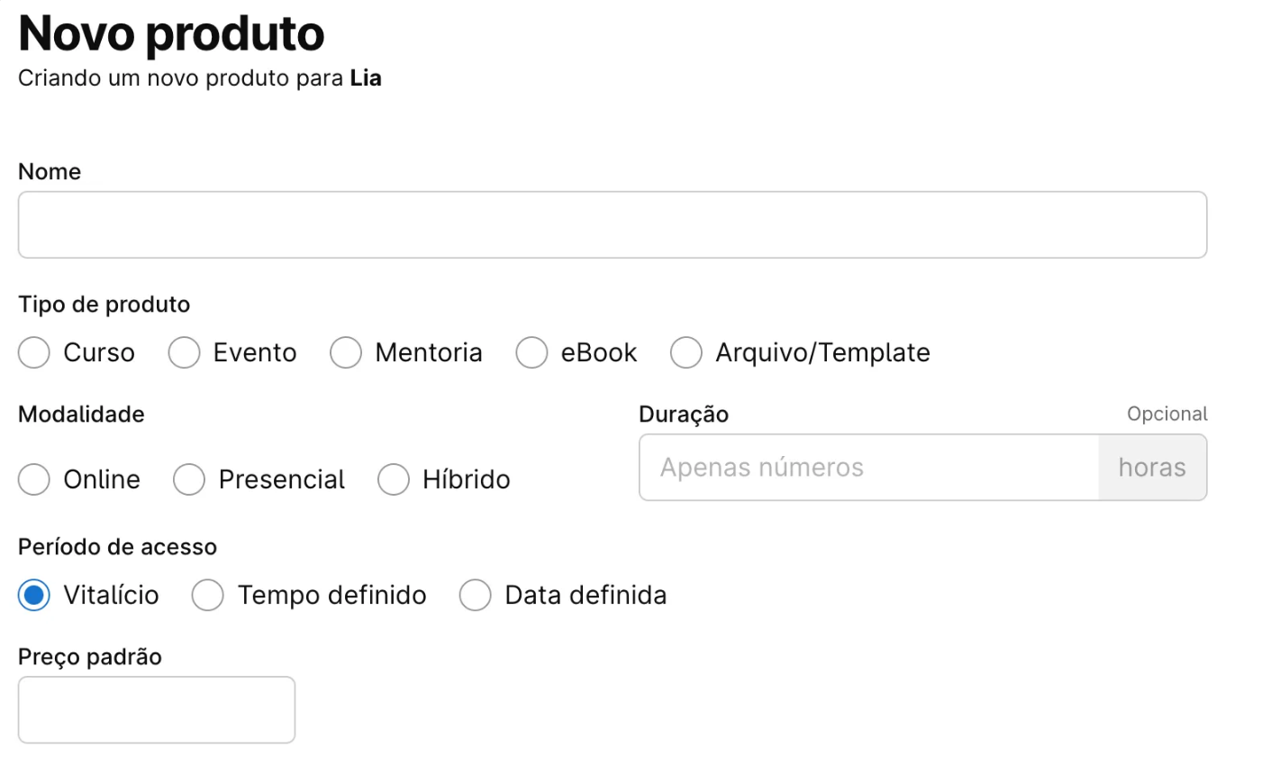 2. Criação do produto: No momento da criação, você deverá inserir os detalhes do seu produto: Nome, tipo de produto, Modalidade, Período de acesso e preço padrão.