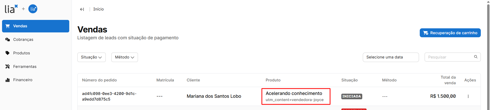 A UTM será salva nos links de venda após a conclusão da primeira da etapa do checkout (Iniciada), ficará visível e passível de exportação na tela de VENDAS: