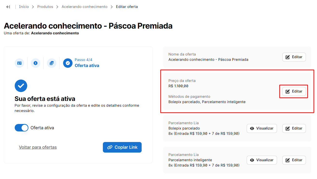 Após o carregamento da aba, selecione a segunda seção da direita que conterá os métodos de pagamentos que estão ativos na oferta, além da possibilidade de inclusão dos demais: