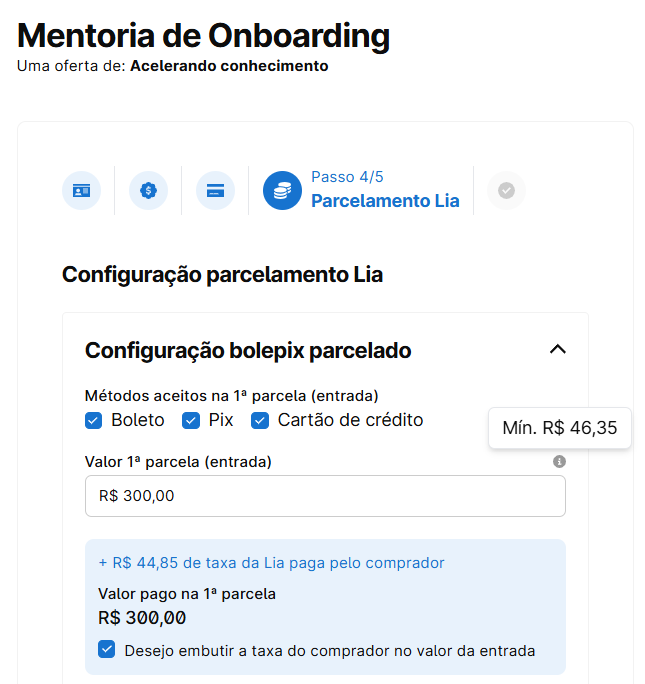 Ao iniciar o cadastro de uma oferta através dos métodos bolepix parcelado ou parcelamento inteligente, você irá verificar uma indicação ou limitação de valor mínimo na entrada.