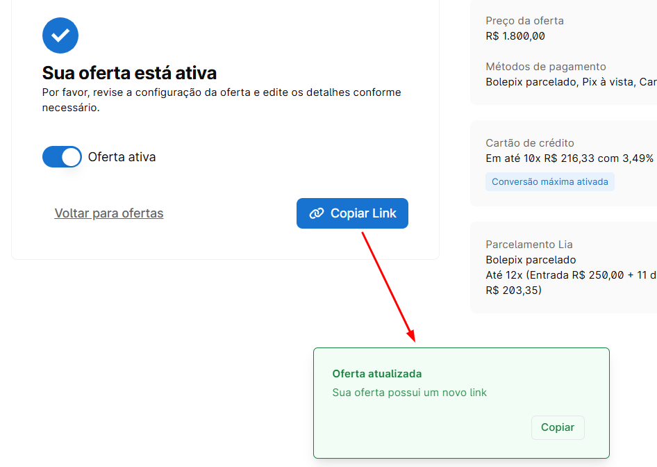 A única informação que mudará o link da oferta é no caso de alterar o valor da oferta. Caso seja necessário alterar o nome, métodos de pagamentos ou juros, o link se manterá o mesmo.