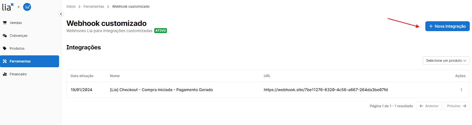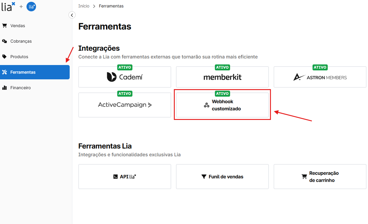 Vá até o painel da Lia > Integrações > Webhooks personalizados