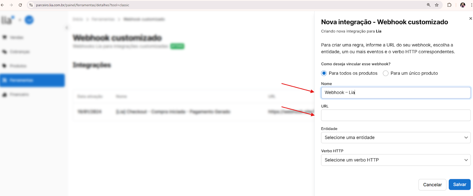 - Nome: Dê um nome para identificar essa integração (ex: Webhook – Lia)